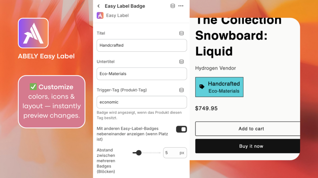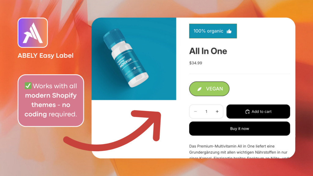 ABELY Easy Label ist eine schlanke Shopify Theme App Extension, mit der du Produkt-Labels direkt im Theme anzeigen kannst – ohne Backend, ohne Performance-Verlust.